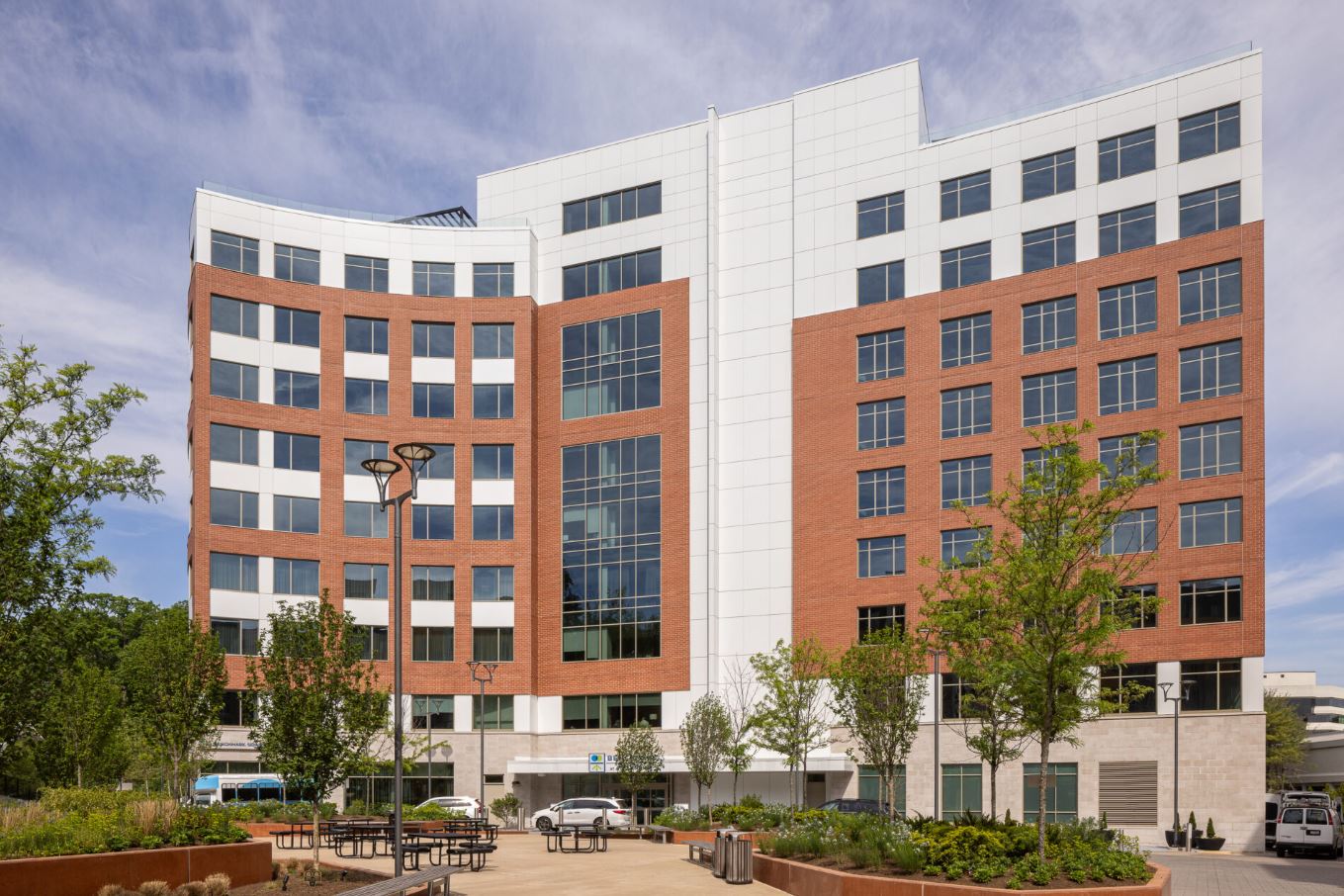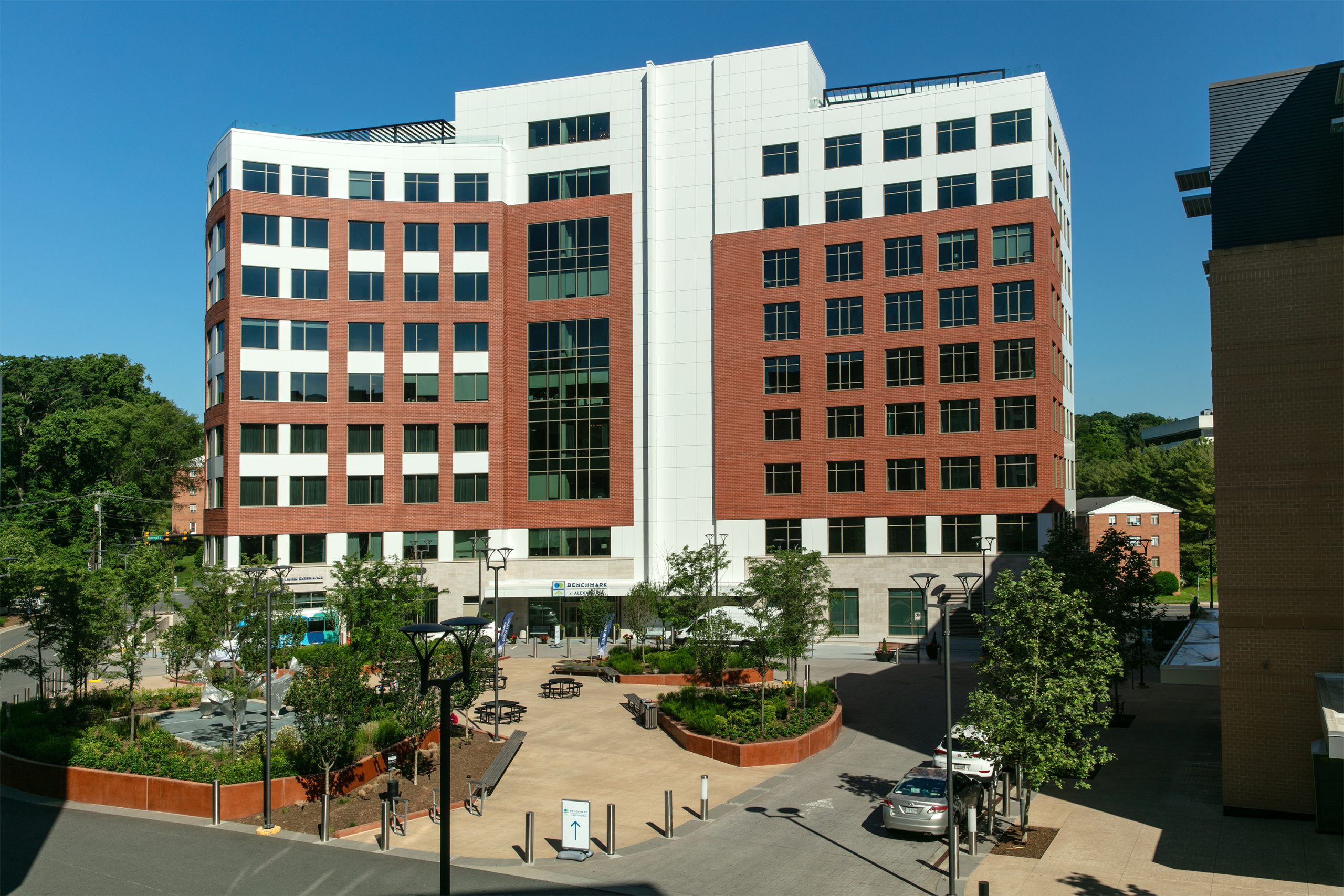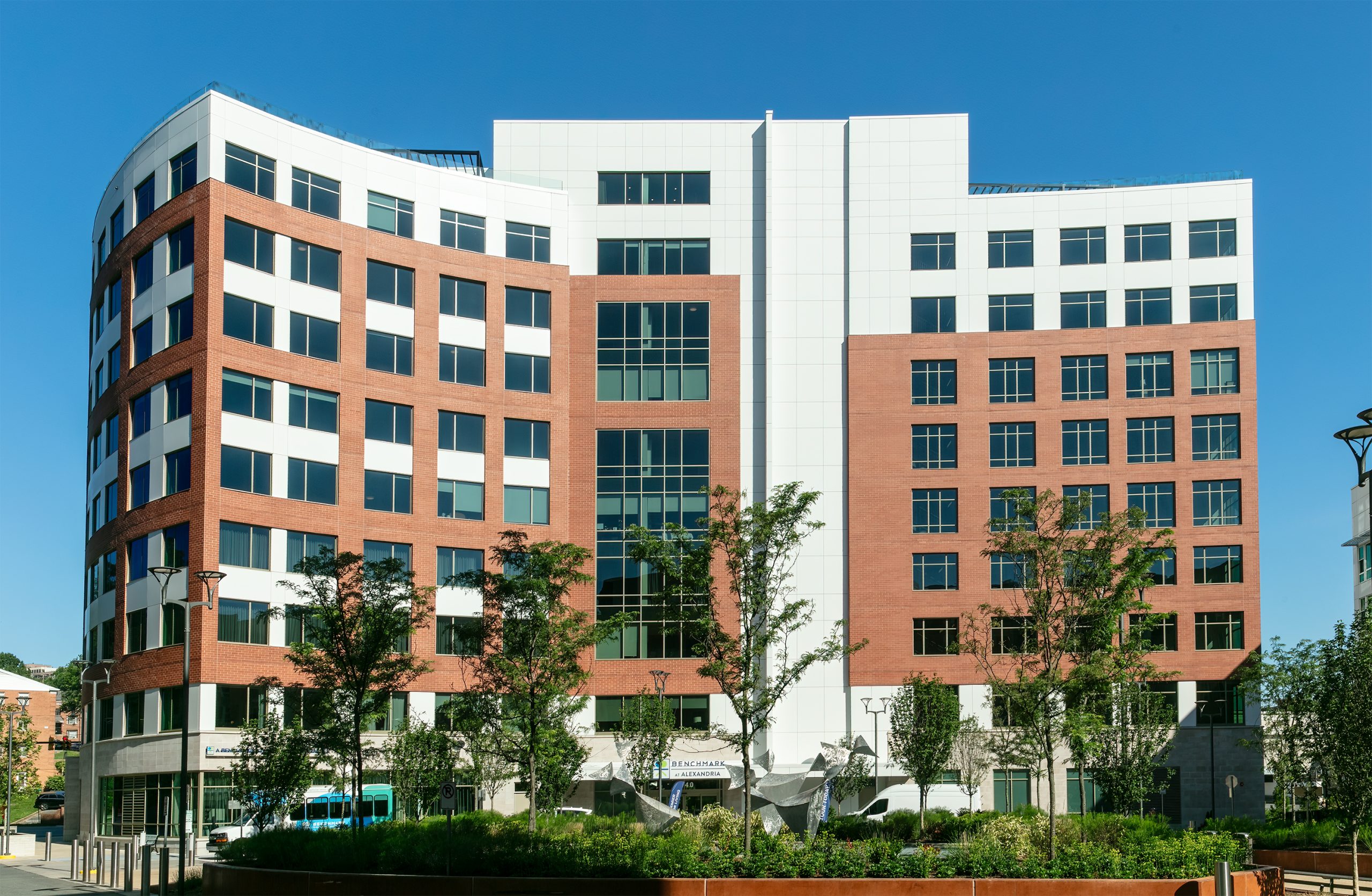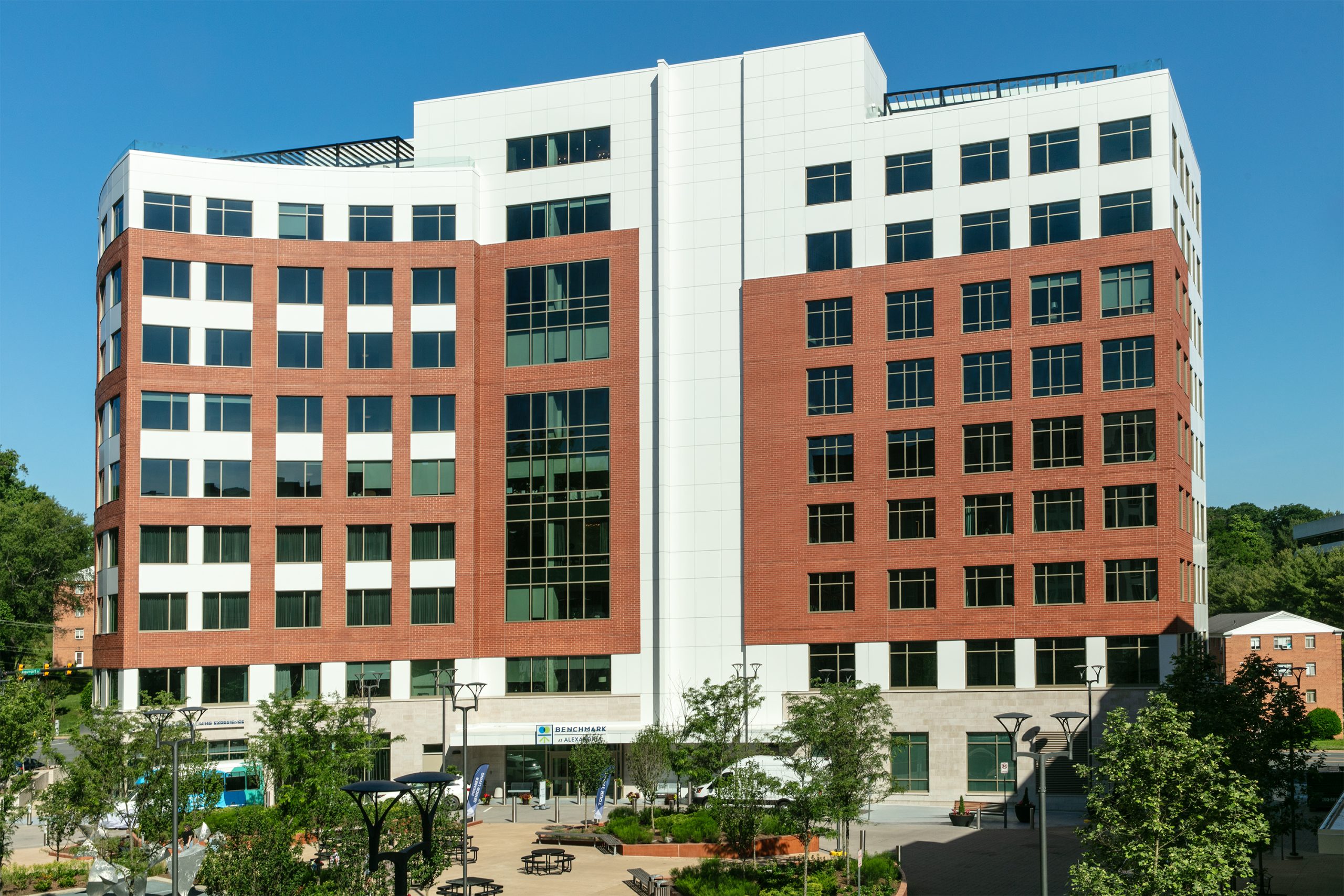 From the historic streets of Alexandria, VA, Benchmark West Alexandria rises with distinction, blending timeless sophistication with modern luxury. The exterior facade of this striking building boasts a unique aesthetic, inspired by classic design principles with a contemporary twist. The project features a thoughtful integration of curtainwall and storefront, supplied by EFCO. Particularly noteworthy is the stunning glasswork throughout the building, expertly designed, installed, and executed by the HiRISE team.